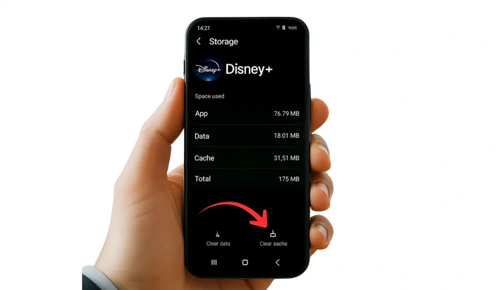 • On phones or tablets: Settings → Apps → Disney Plus → Storage → Clear Cache / Clear Data.